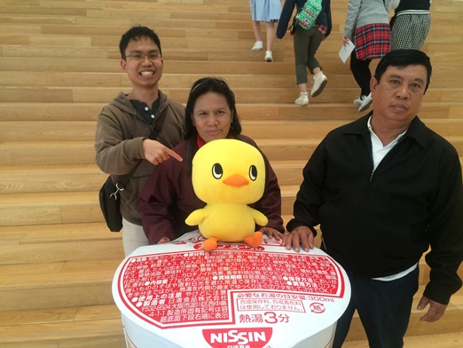 Sudah jam 5.30 rupanya. Kami pun bergegas menuju ke lantai dasar. Di sini kami pun mengambil beberapa foto dengan ikon museum ini yaitu “Anak Ayam” dan juga “Cup” Benar, karena nama mie instan pertama adalah Chicken Ramen, makanya ayam identik dengan museum ini. Setelah itu, kami pun melanjutkan perjalanan ke Yokohama Cosmo World.