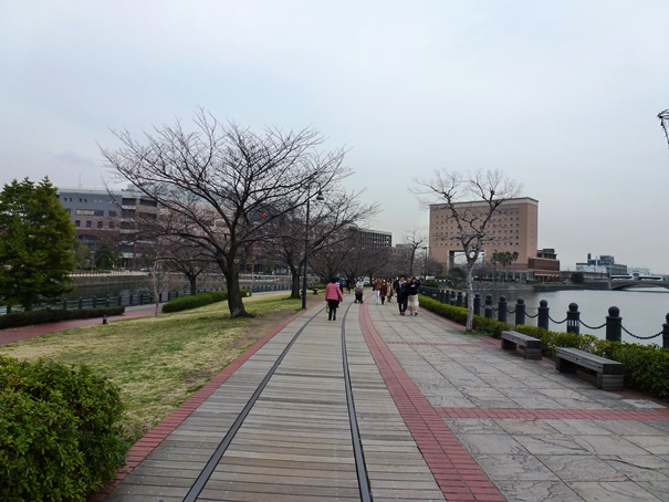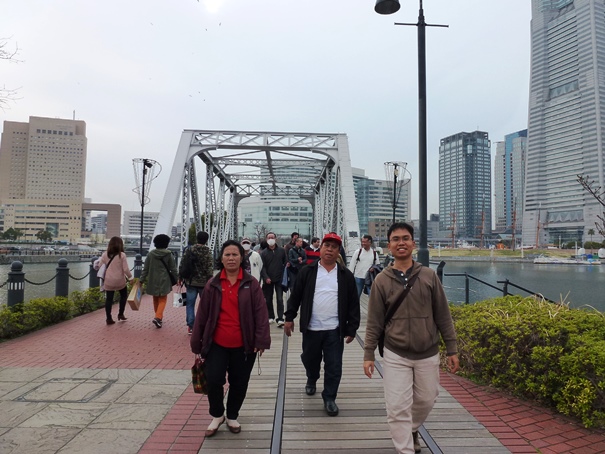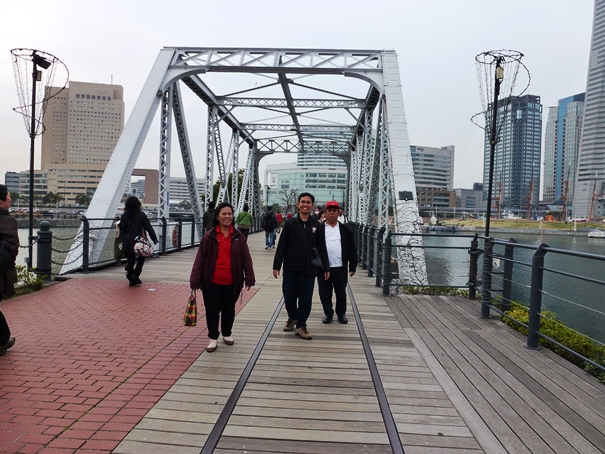 Setelah beristirahat sejenak dan mengisi perut,kami melanjutkan perjalanan menuju ke arah Yokohama World Porter dan Red Brick Warehouses. Letaknya ada di sebuah daratan terpisah di Teluk Tokyo. Nama area itu adalah Shinko. Saya rasa daerah itu adalah pulau buatan yang ditujukan sebagai pelabuhan Yokohama. untuk Untuk dapat mencapai pulau buatan tersebut, kami harus menyeberangi Teluk Tokyo melalu sebuah jembatan legendaris. Namanya adalah Kishamichi Promenade.