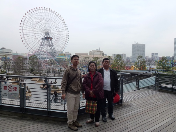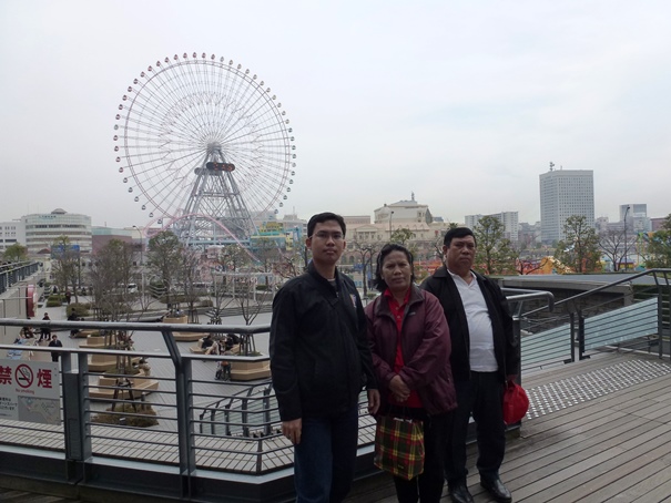 Kami keluar dari sisi samping mal menuju ke balkon dan hall di mana kami dapat melihat laut di depan mata. Itulah Tokyo Bay atau Teluk Tokyo. Di balkon luas ini kami sempat mengambil beberapa foto sambil beristirahat sejenak di bangku yang tersedia. Sejauh mata memandang, ada taman bermain lengkap dengan bianglala di pinggir laut dan juga ada museum berbentuk kapal di Pelabuhan Yokohama. Udara siang itu tidak terlalu dingin, namun angin dari arah laut tetap berhembus dengan kencang.