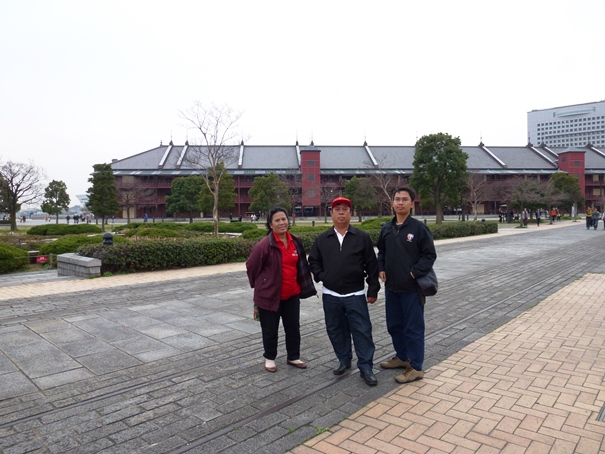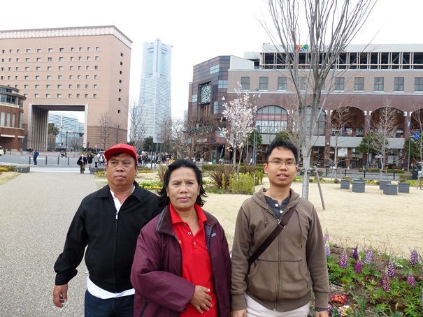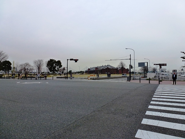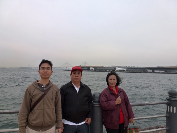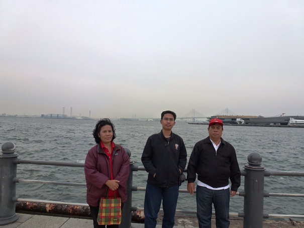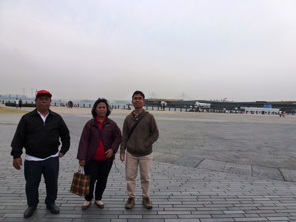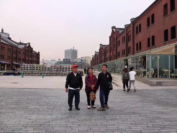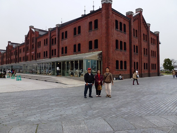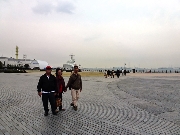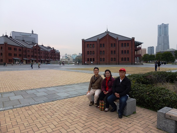 Setelah mengambil beberapa foto di sini bangunan Level 1, kami kemudian menyeberangi jalan dan langsung menuju ke Yokohama Red Brick Warehouse. Kira-kira seratus meter jaraknya. Sudah jam 15.30, awan kelabu mulai menggelayut di Teluk Tokyo, tiupan angin terasa makin kencang. Wajar, karena kami kini berada di bangunan paling luar di Shinko. Tidak ada lagi bangunan yang melindungi kami. Angin laut kencang dari arah teluk Tokyo langsung menerpa kami. Untung saja, saya, Papa, dan Mama mengenakan jaket yang agak tebal sehingga tidak terlalu merasa kedinginan.