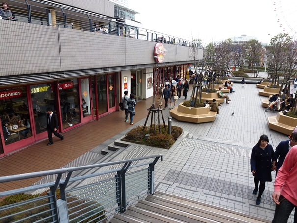 Kami keluar dari sisi samping mal menuju ke balkon dan hall di mana kami dapat melihat laut di depan mata. Itulah Tokyo Bay atau Teluk Tokyo. Di balkon luas ini kami sempat mengambil beberapa foto sambil beristirahat sejenak di bangku yang tersedia. Sejauh mata memandang, ada taman bermain lengkap dengan bianglala di pinggir laut dan juga ada museum berbentuk kapal di Pelabuhan Yokohama. Udara siang itu tidak terlalu dingin, namun angin dari arah laut tetap berhembus dengan kencang.