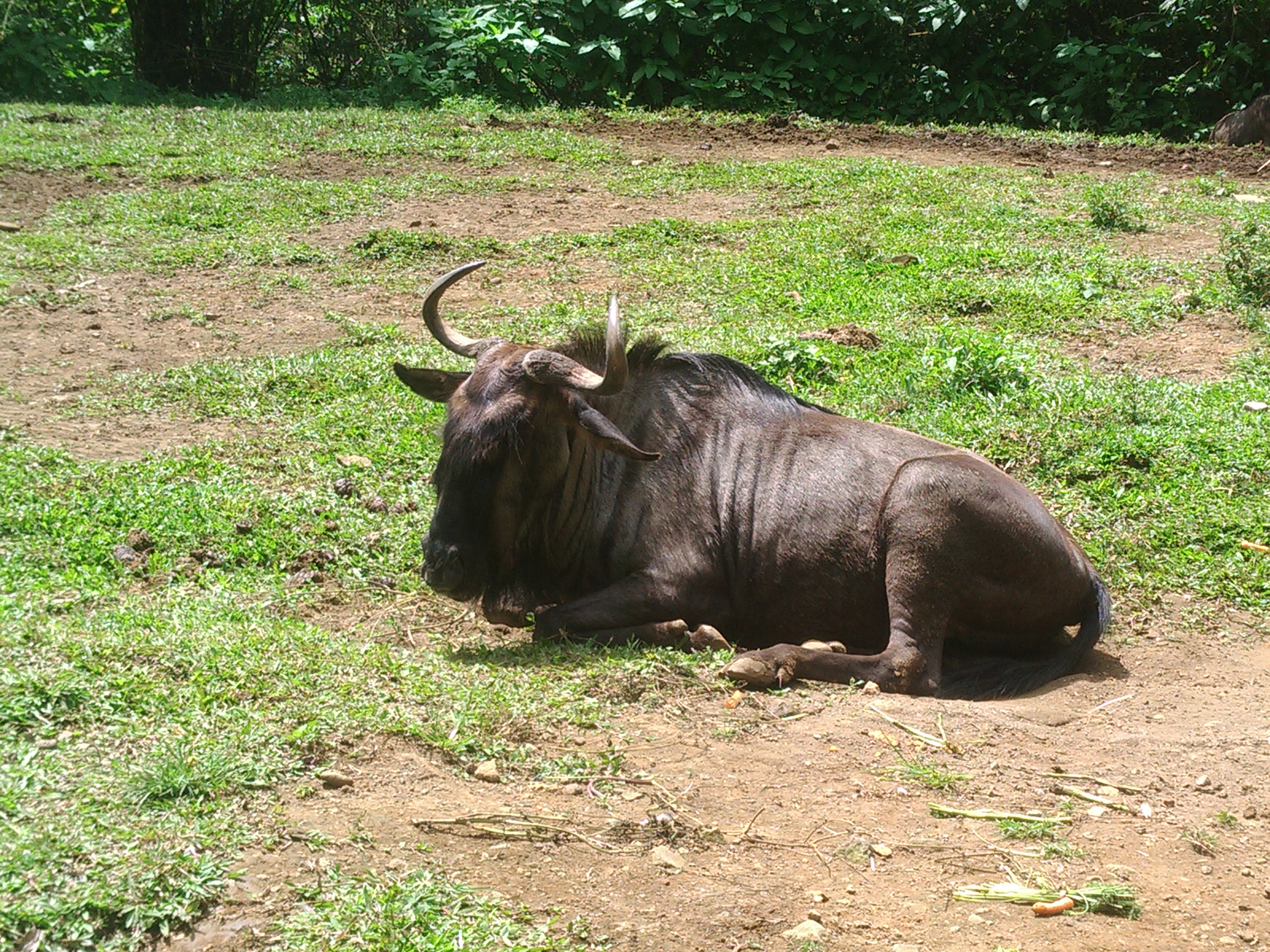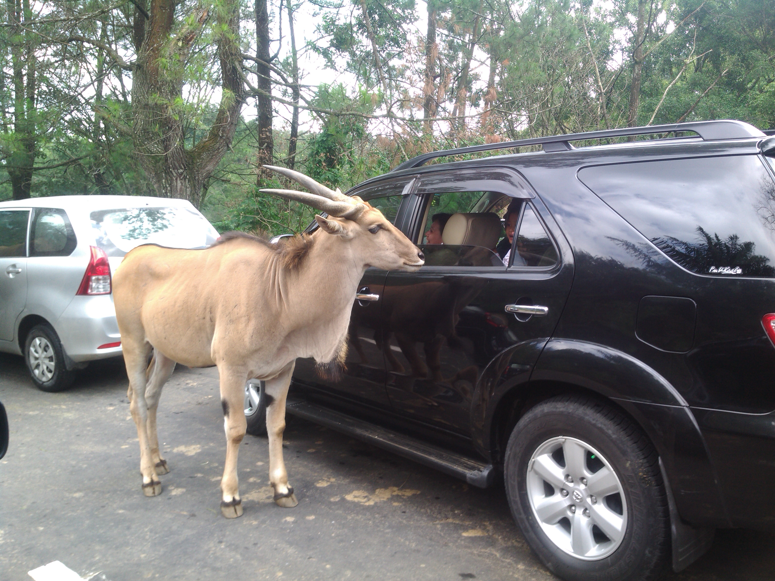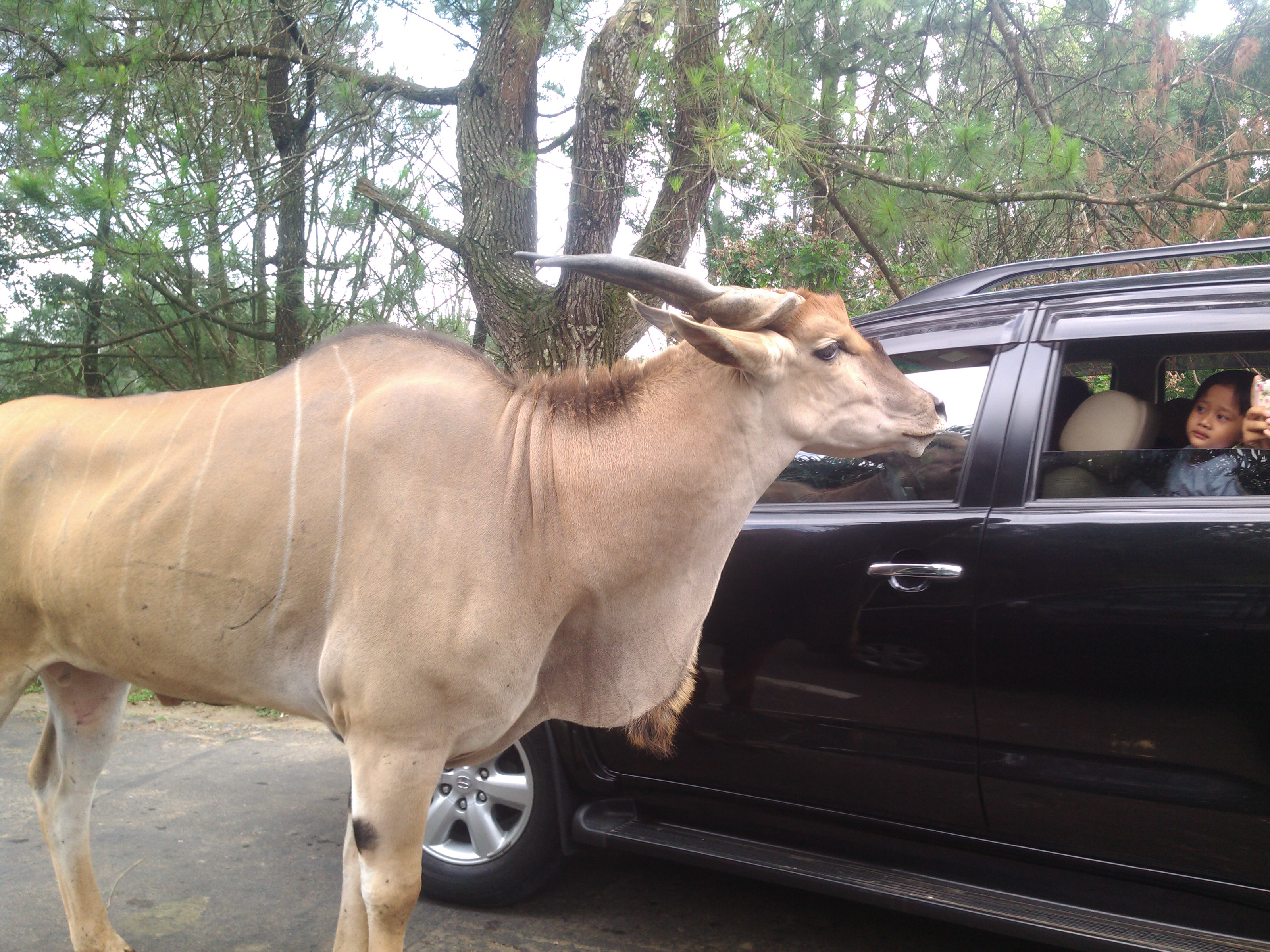 Kemudian di kawasan berikutnya, kami juga melihat wildebeest yang sedang duduk bersantai. Juga anoa yang sedang berinteraksi dengan pengunjung yang memberikan wortel dari mobil. Ukurannya hampir setara satu buah mobil. Luar biasa. Ada juga rusa Gazelle yang sedang makan di kejauhan.