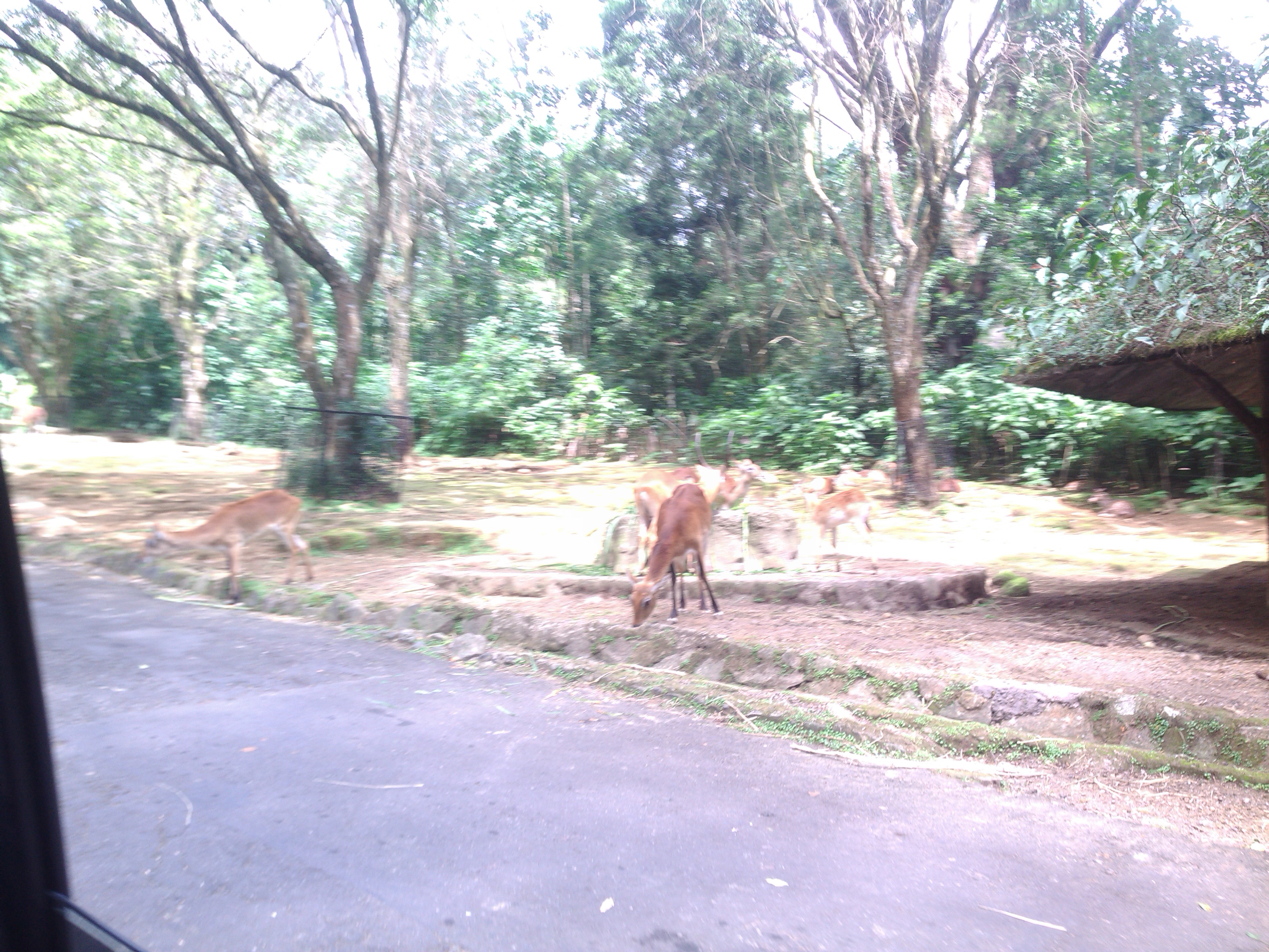 Ada sejenis rusa besar yang memiliki tanduk. Ada juga burung cendrawasih yang dengan bebasnya berjalan-jalan dan memakan pisang yang diberikan pengunjung. Saya bingung, apakah ini rusa, kerbau, atau anoa yah? Kemudian kami juga melihat kawanan jerapah yang sedang menghindari panas terik di bawah tudung sambil makan rumput. Jadi, inilah foto-fotonya saat kami di Taman Safari. Selamat menikmati:)