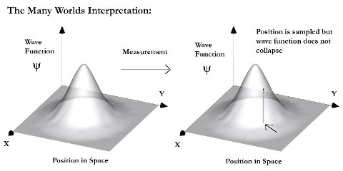 Kemudian mari membandingkannya dengan gambar di bawah ini. Gambar di bawah sebelah kiri menunjukkan keadaan superposisi dari wave function. Karena pengamatan (measurement) dilakukan, posisi objek dipastikan. Namun menurut interpretasi ini keadaan superposisi tidak runtuh, penyusutan fungsi gelombang pun tidak ada.